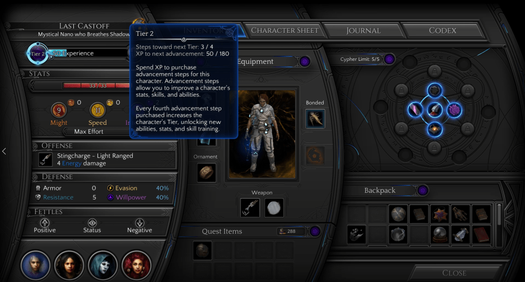 This is a very different approach than what the Cypher System offers; however, it can make the game feel a little bit more familiar to traditional fantasy RPG mechanics if you prefer that. Torment: Tides of Numenera works as a sort of proof of concept to demonstrate that you can in fact count XP this way and still hold on to a good bulk of the Cypher System.